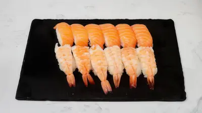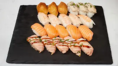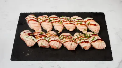 Tempura katkarapu maki x8, lohi nigiri x3, grillattu lohi nigiri x3, katkarapu x2, gunkan tonnikala ja majonessi x2, grillattu lohi x2