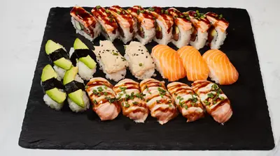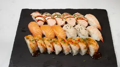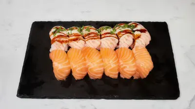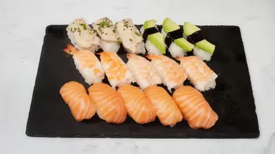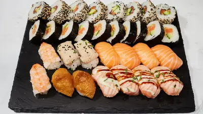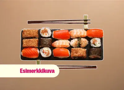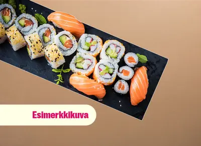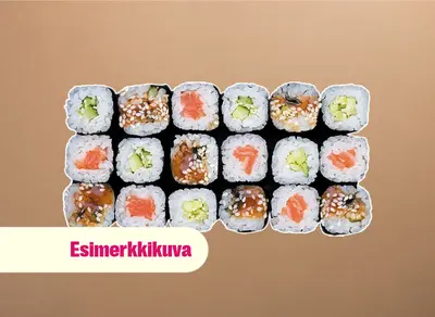 California maki x8 (surimi, avokado, kurkku, villakuoreen mäti), sake futomaki x10 (lohi, kurkku, avokado, marinoitu retiisi), lohi nigiri x4, grillattu lohi nigiri x4, katkarapu x2, tofu x2, gunkan tonnikala ja majoneesi x2