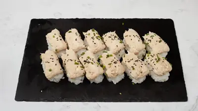 Grillattu lohi x5, lohi x5, katkarapu x5, tofu x3, tonnikalakastikkeessa x3