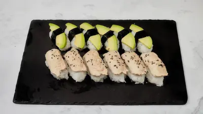Yaki maki x8 (grillattu lohi, surimi, avokado, ankeriaskastike), avokado nigiri x4, lohi nigiri x3, grillattu lohi nigiri x3