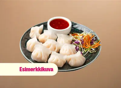 Katkarapu-dumplingit kuuluvat alkuruokiin ja niitä tarjoillaan 5 kappaletta.
